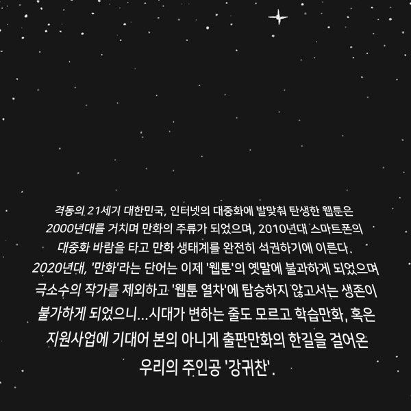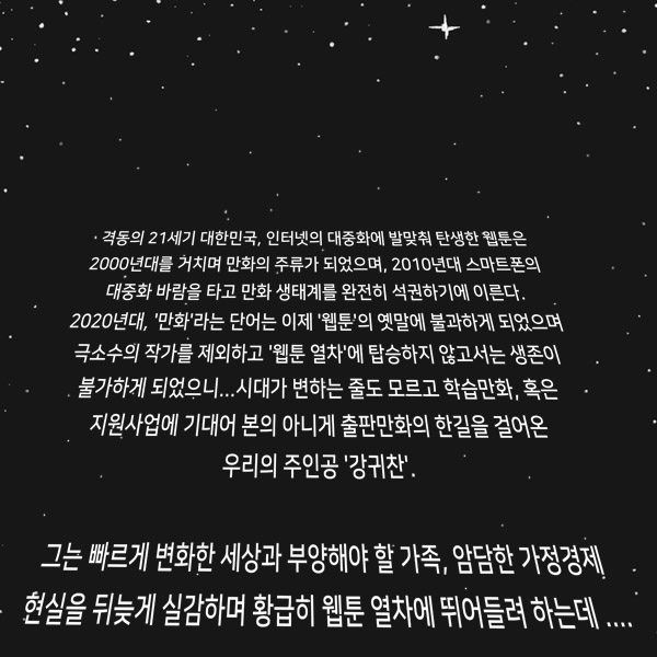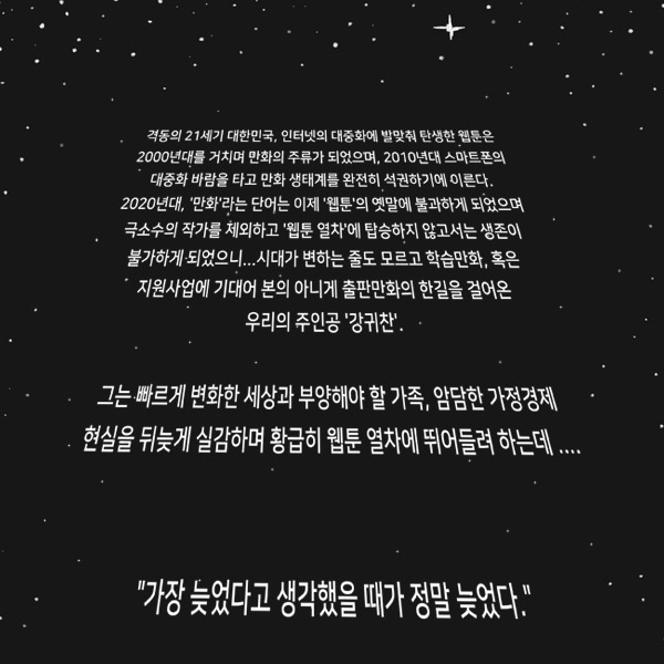 중년 만화가 강귀찬의 뒤 늦은 웹툰작가 도전기. "가장 늦었다고 생각했을 때가 정말 늦었다."